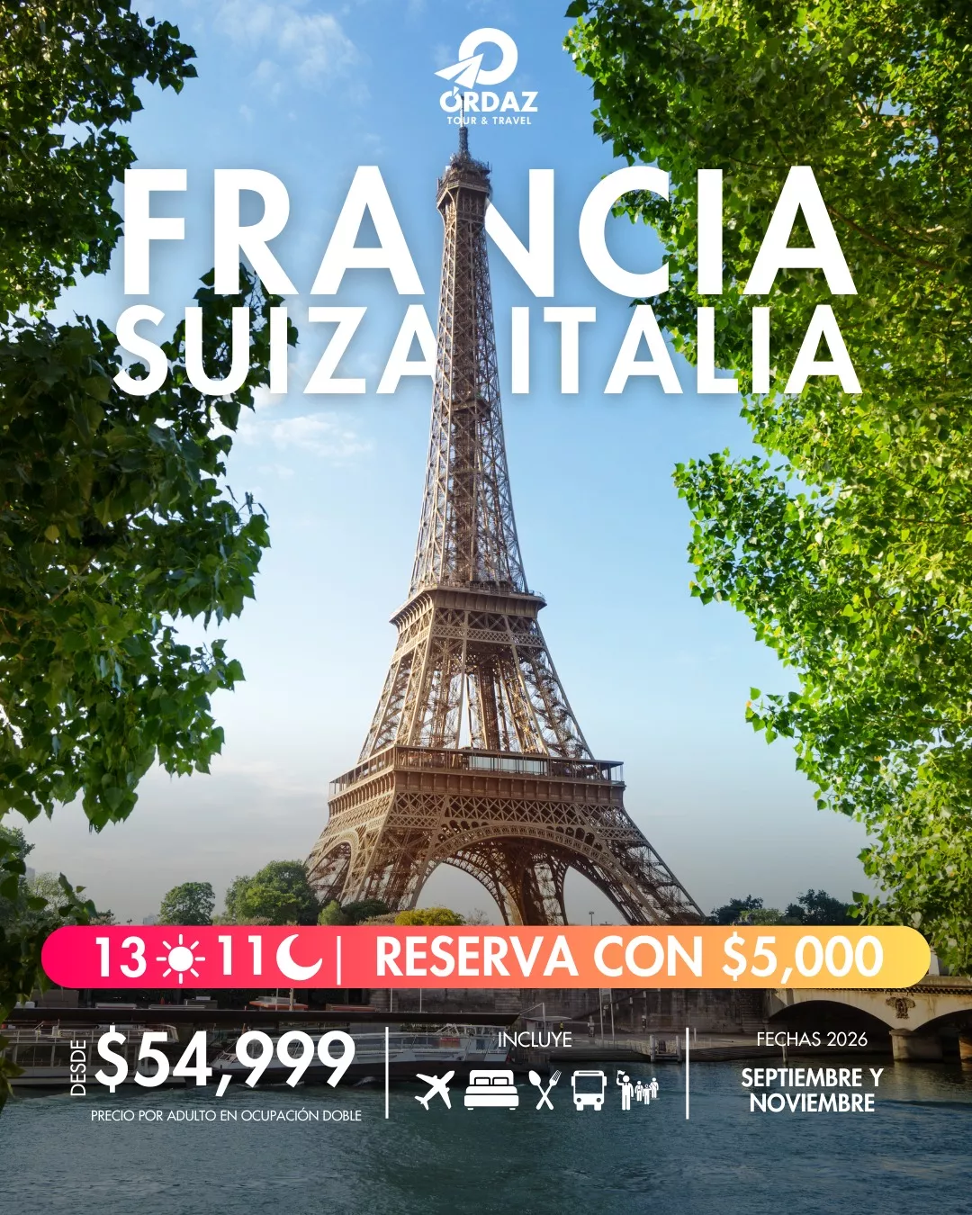 13 días y 11 noches recorriendo las calles románticas de París, los paisajes alpinos suizos y el encanto italiano que nunca se olvida.
